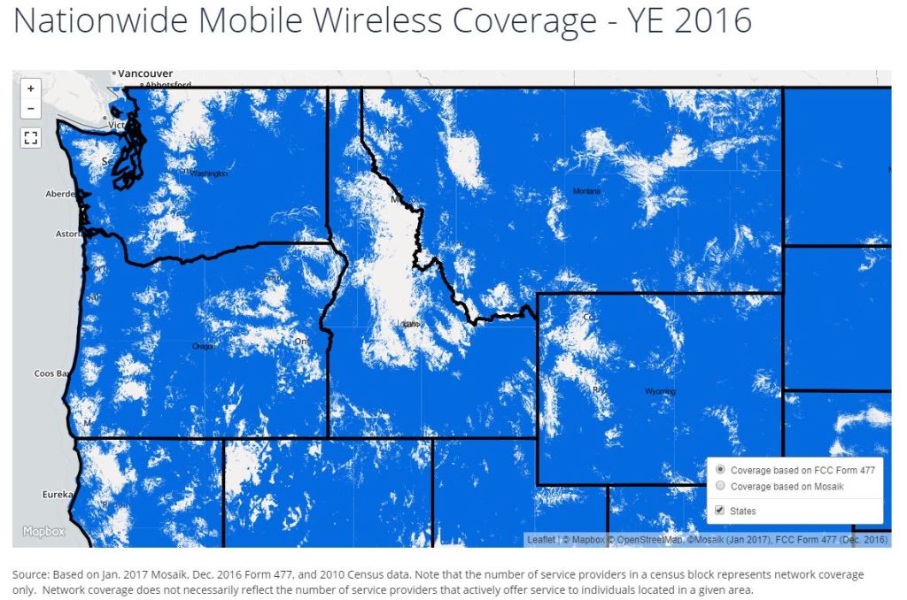 It turns out that current Federal Communication Commission (FCC) rules allow cell phone companies to claim coverage if their service can be accessed by a single user within a given census block. This data is submitted to the FCC via form 477. This may provide acceptably accurate spatial data for dense urban areas with compact census blocks, but for more sparsely populated suburban and rural areas this methodology likely overstates broadband coverage areas.