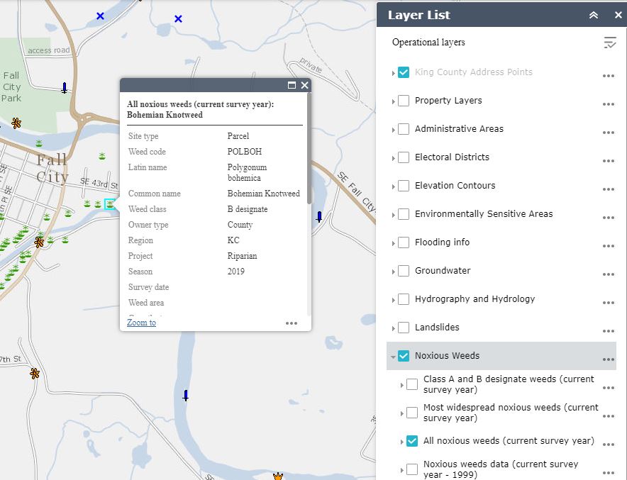 The Federal Noxious Weed Act of 1974 gave the United States Secretary of Agriculture the responsibility to identify noxious weeds and implement programs for their control. The following year Washington state passed legislation authorizing the establishment of noxious weed control boards in its counties. King County’s own Noxious Weed Control Program has used GIS for many years. Results of their work can be see in King County’s iMap which includes noxious weeds layers that can help educate the public about threats in their own neighborhoods.
