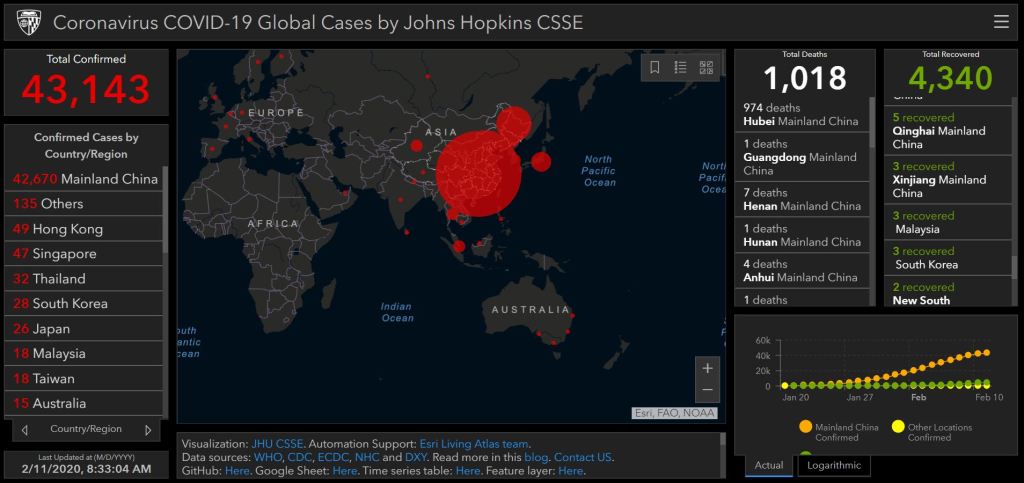 I quickly discovered an excellent interactive map from Johns Hopkins University’s Center for Systems Science and Engineering (CSSE) to track the spread of 2019-nCoV (2019 novel coronavirus). Mapping 2019-nCoV is a GIS based dashboard that aggregates 2019-nCoV data from the World Health Organization, U.S. Center for Disease Control, and sources from within China. The CSSE online dashboard, Coronavirus 2019-nCoV Global Cases, provides worldwide statistical data at country and regional levels, records total cases, mortality, and people who have recovered, plus graphs that show total cases by day in both mainland China and other locations. The focus of the dashboard is an interactive map that allows drilling down into individual countries or regions across the world. The Johns Hopkins CSSE 2019-nCoV dashboard also allows download of their aggregated source data.