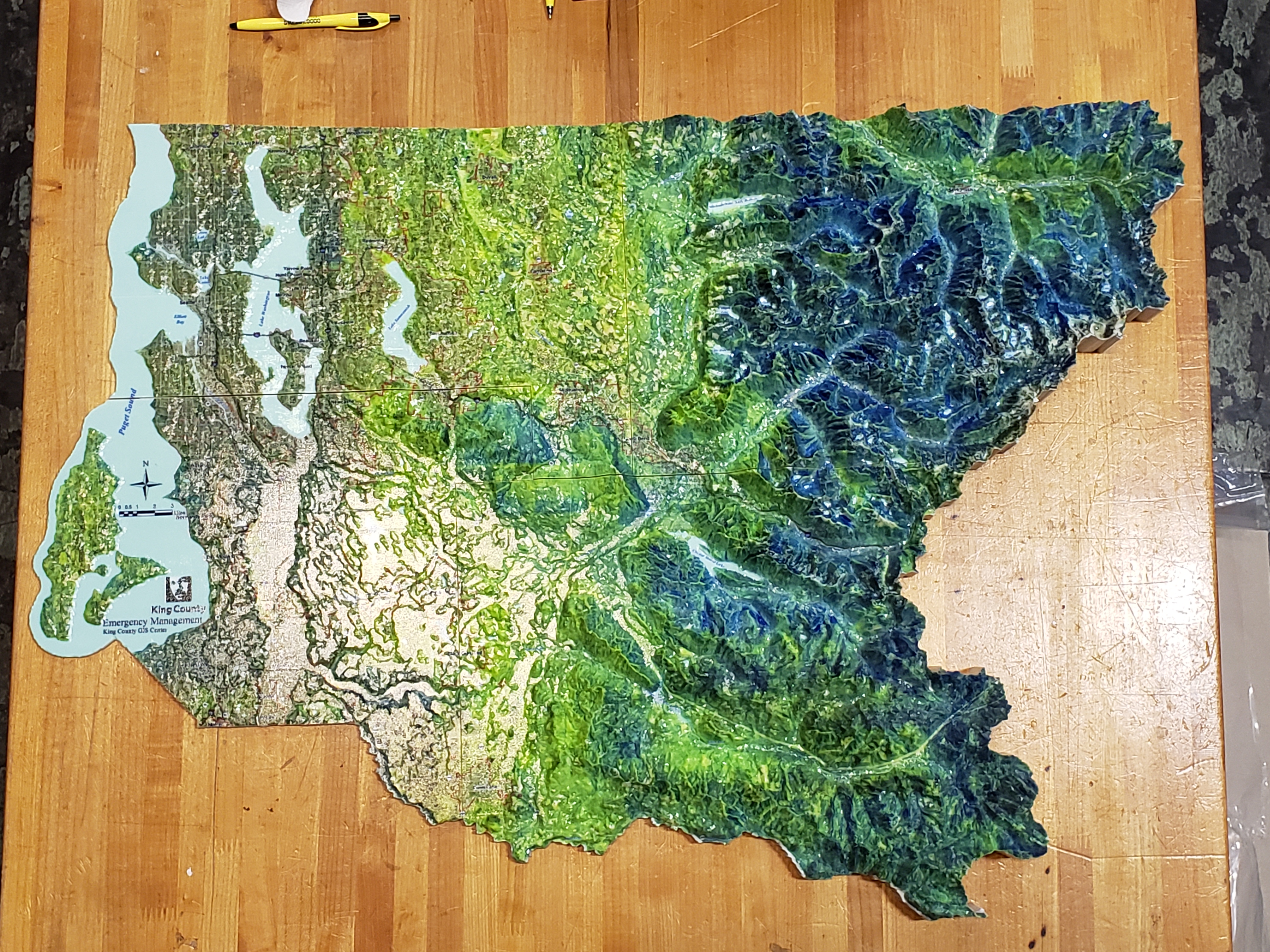At the KCGIS Center, we provide a variety of geospatial mapping and analyses to internal and external clients. Recently, the King County Office of Emergency Management asked us to create a physical topographic model of the county with an aerial photo applied. In a purely digital format, this is a simple task. With our ArcGIS 3D modeling software, ArcScene, you can easily take a digital elevation model or other 3D format and visualize it on your screen. Draping aerial photos, 3D building models, or other geographic data on top is an easy process. Getting it into a format that could be translated into a physical object turned out to be more complex.