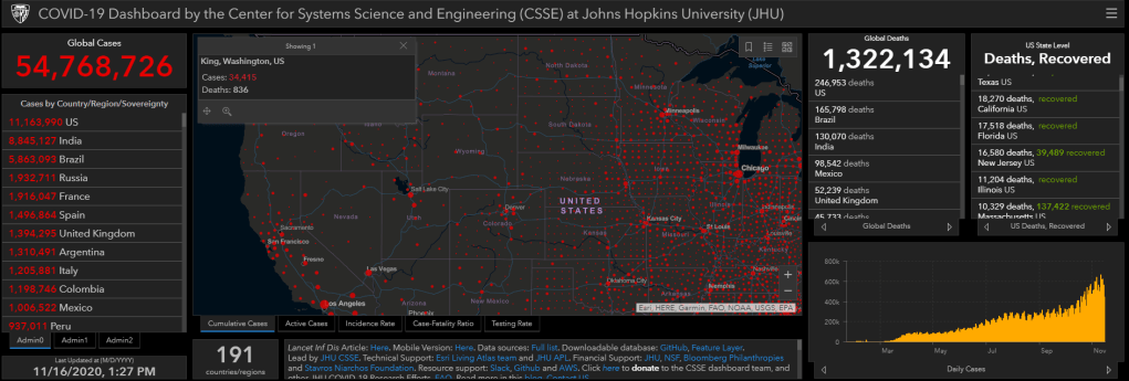 With the impact of COVID-19 on the rise across the globe, GIS Day 2020 is like no other. And because of COVID-19, GIS is more important than ever. One year ago, few people knew what a GIS-based dashboard was. In January, 2020, Dr. Lauren Gardner of the Johns Hopkins Center for System Science and Engineering developed the COVID-19 dashboard. When we wrote about this dashboard in GIS & You in mid-February, barely 50,000 cases had been identified. Today, the Johns Hopkins University Coronavirus Map has been seen and used by billions of people around the world.