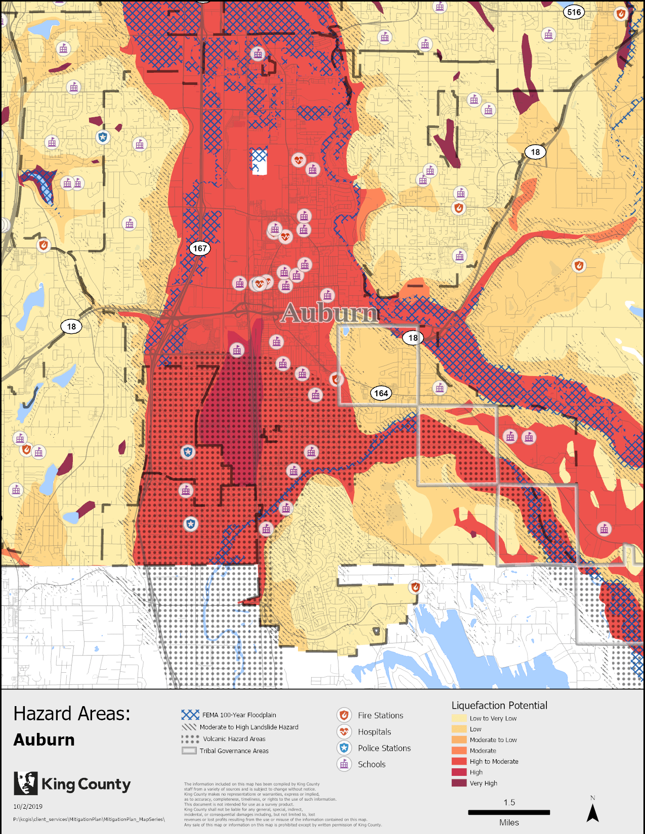 The hazards identified and mapped included liquefaction potential, 100-year floodplains, volcanic and lahar zones, and potential landslide areas. These dangers were overlaid with a variety of potentially vulnerable infrastructure, allowing the Office of Emergency Management to identify potential risks and consequences of hazard impacts for a variety of populations and structures.