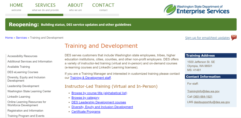 The Department of Enterprise Services serves many other entities such as cities, counties, tribes, higher education, etc. Contact your designated training representative or use this online form to submit your training registration request.