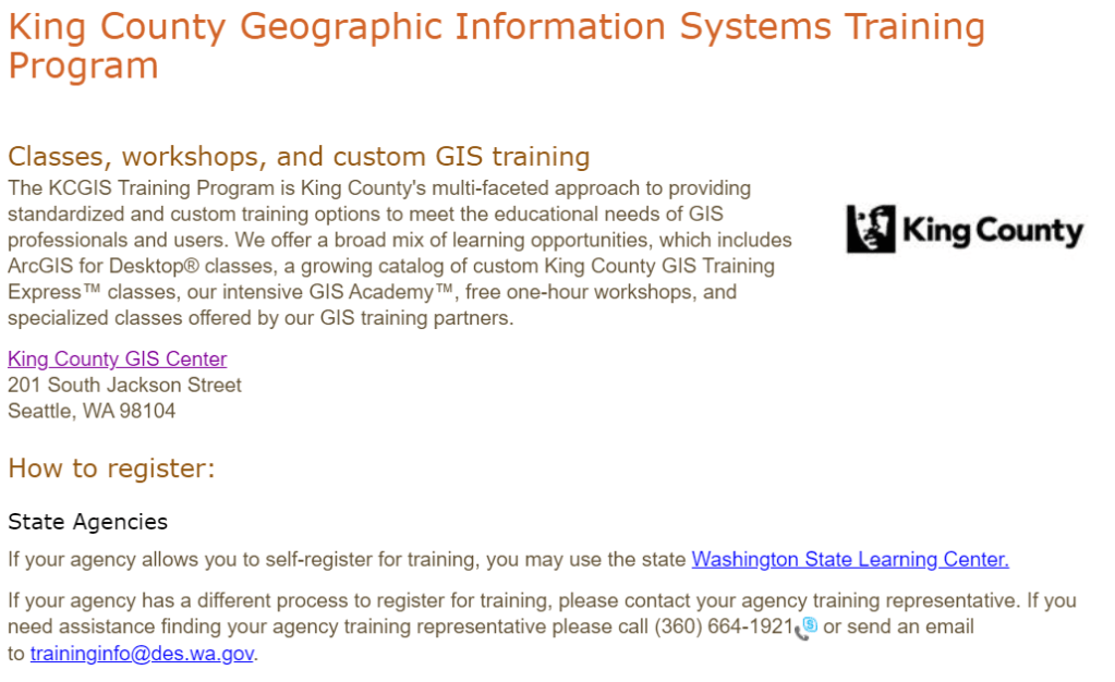 In May of 2011 the responsibility for managing state-wide training transferred from DOP to the Department of Enterprise Services (DES), and a new Interagency Agreement was entered into. Since this agreement, DES has been able to coordinate training seats for over a dozen different GIS classes, from GIS Fundamentals to Advanced GIS courses. In 2020, during the pandemic when training abruptly shifted from in-person to virtual platforms, King County was able to continue offering classes and DES made them available for state employees to enroll.