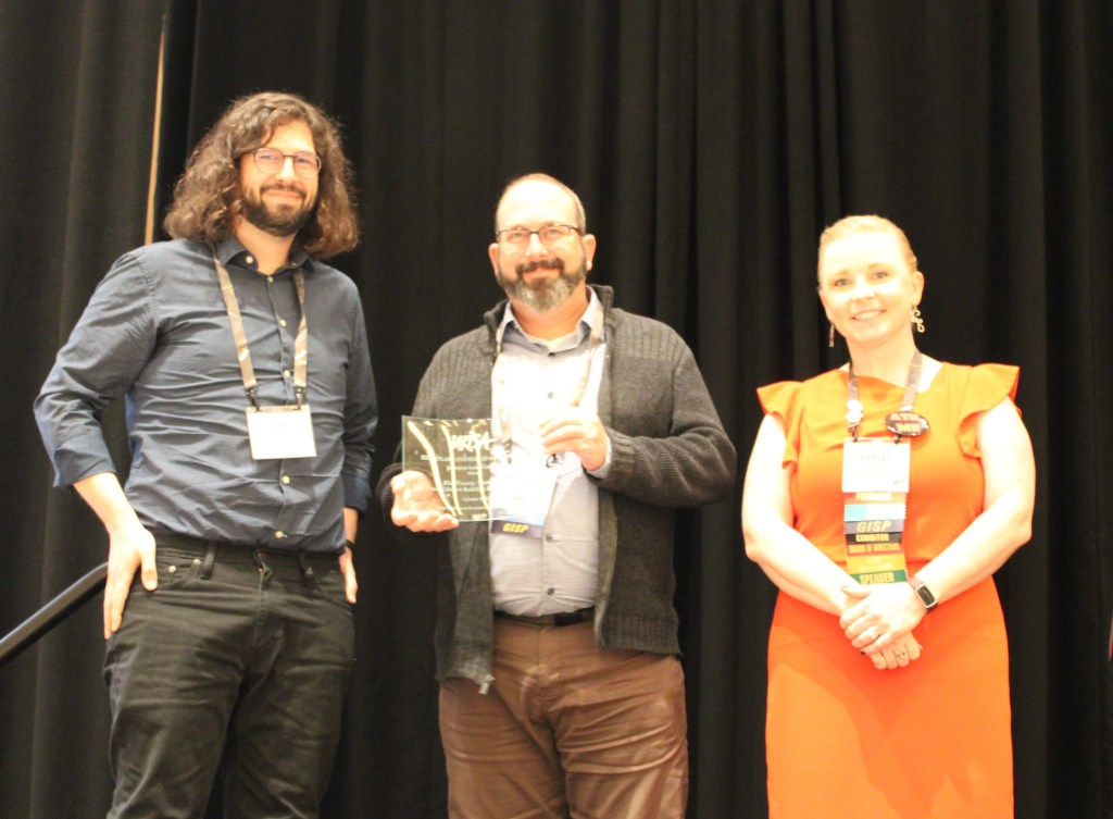 Fred Lott (L) and Michael Jenkins (C) accept the 2023 ESIG Award from URISA President Ashley Hitt