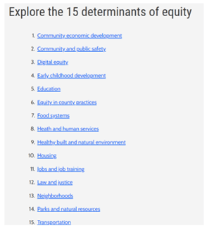 King County is a great place to live, learn, work, and play. But this is dependent on your race and where you live. King County is committed to addressing this inequity, so it has developed an Equity and Social Justice Plan. This outlines four major paths to making positive and transformative changes – invest where the needs are greatest, invest in employees, invest in community partnerships, and provide transparent and accountable leadership . To measure how these initiatives are working, King County identified 15 conditions, or determinants of equity, that each of us needs to thrive. These in turn use indicators to show a high level of understanding of these conditions, thus giving policymakers a better understanding of equity when making decisions.
