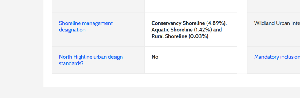 When you query for a parcel using the DDCR, the application checks to see if it is in a Shoreline Management Designation area. If it does, the application runs an additional check deliver detailed data on all the designations that apply. There can be more than one designation, especially for large rural parcels. To support permitting workflows for residents, real-estate developers, districts, and our own permitting team we calculate the percentage of the parcel that is covered by each Shoreline Management Designation.