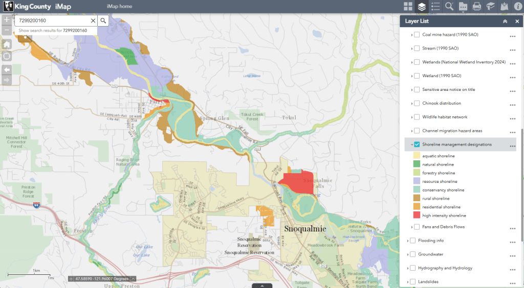 According to the Department of Ecology at the State of Washington, “… Shoreline Management Designations are classifications of shoreline areas that reflect local shoreline conditions, including ecological functions and shoreline development.” In King County, portions of properties along major rivers and the Puget Sound shoreline of Vashon Island typically qualify for this designation. There are eight Shoreline Designations in this dataset ranging from common designations like Aquatic and Natural shoreline to less common variations like Residential and High Intensity shoreline. Shorelines inside municipalities (like Seattle) are not regulated by King County and aren’t in this dataset.