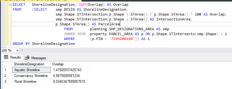 We now use a spatial query to calculate the overlap of the parcel and the designation polygons. This query replaced a 60-line function for handling Shoreline Management Designations with a 6-line function that returns the results of the query. This cut page load times from ~5.5 seconds to just ~2 seconds.